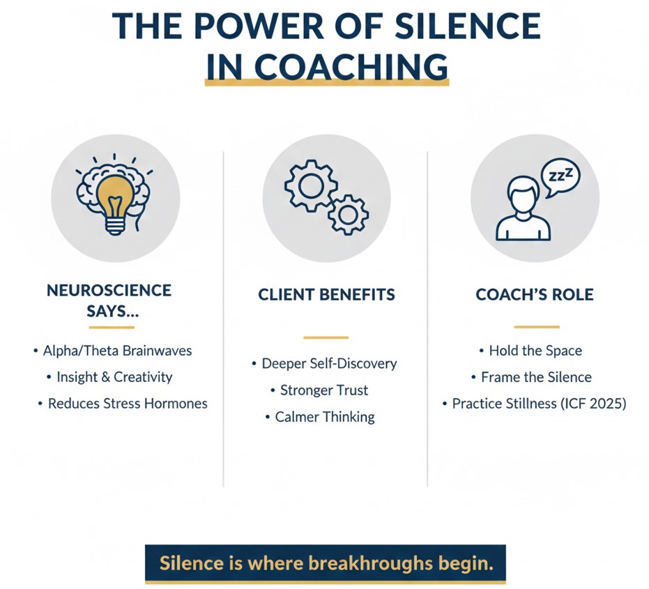 The updated ICF Core Competencies for 2025 now explicitly name silence as a facilitation tool alongside questioning and metaphor, a formal recognition that it belongs at the heart of skilled coaching.